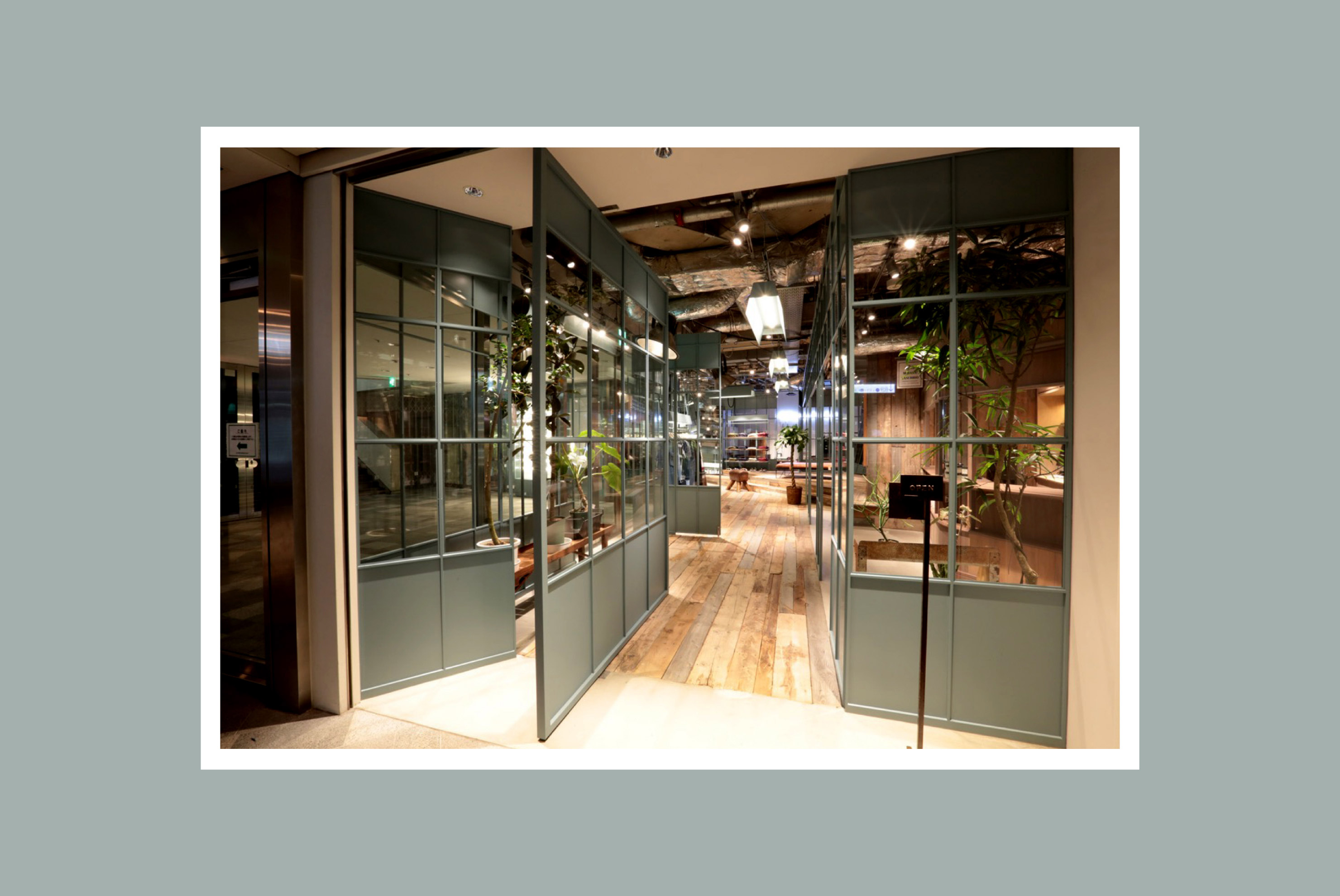 Flagship store interior at Omotesando Hill featuring the ‘blue-grey’ metal frames as seen in Mihara-san’s home