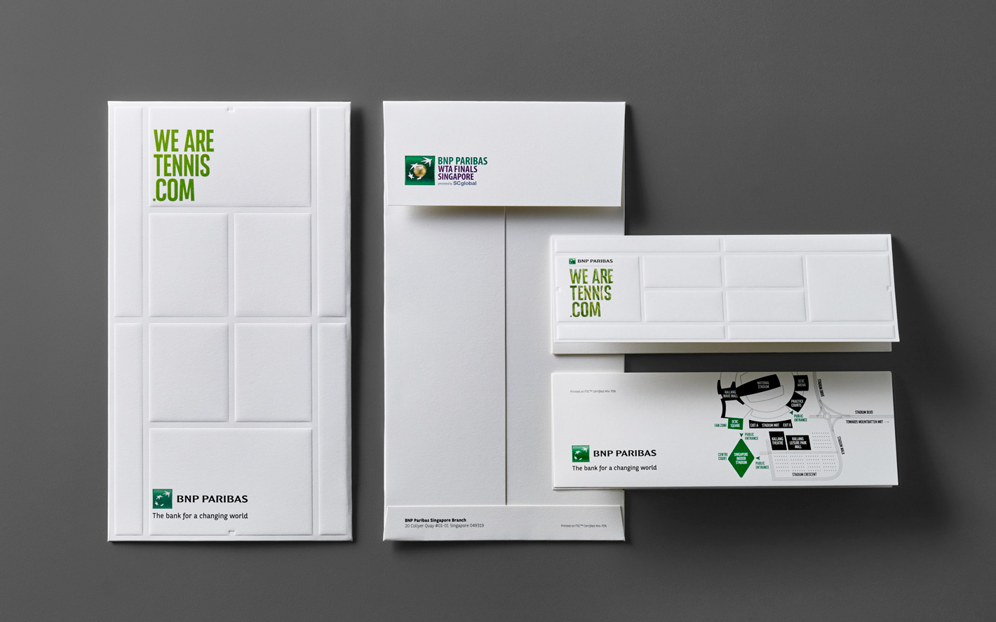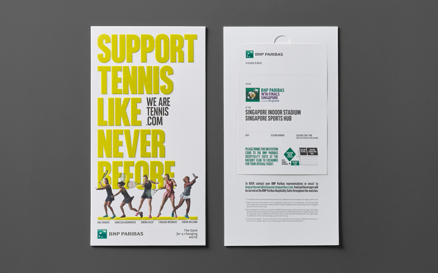 GET IN TOUCHOur brief from BNP Paribas was to create visually arresting designs for an invitation card and ticketing sleeve for the WTA Finals 2015. &Larry answered with a pair of designs that not only looked right but also felt right for the part, utilising flocking on the invitation card to evoke the texture of a tennis ball, and a blind-debossed grid for the ticketing sleeve and envelope to recreate familiar tennis court markings.