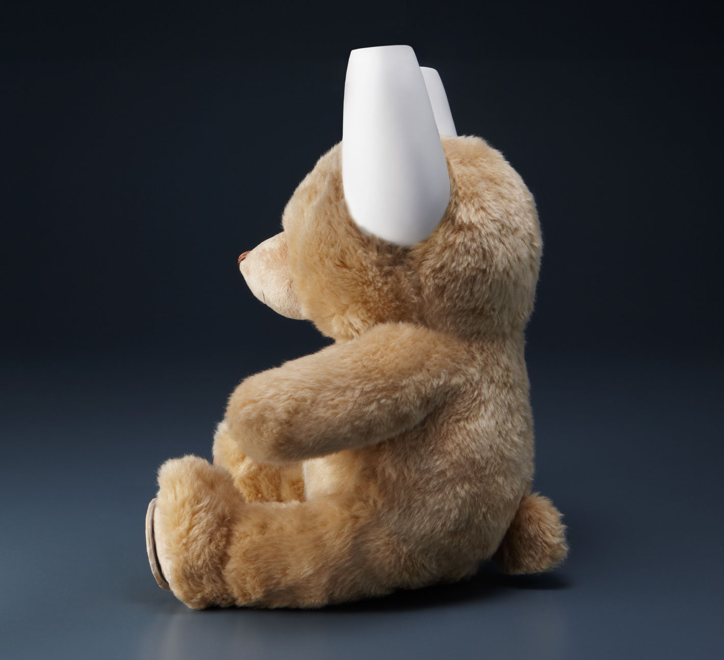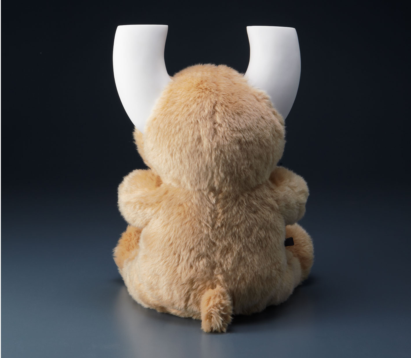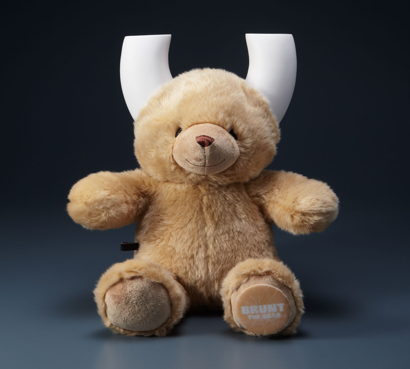 The brief was simple: we could do whatever we wanted. Intrigued by the horns on the toy which were designed to display Nooka watches, we decided to keep their functionality in our interpretation. We imagined a teddy bear plushie being taken over by the toy. The horns piercing out of the bear’s head are testament to the clash. Since the bear bore and survived the brunt of the “impact”, we named it Brunt the Bear.