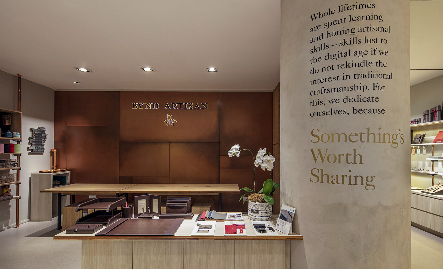 GET IN TOUCHWorking together with IGX Design Studio, we successfully transplanted the spirit of Bynd Artisan’s original flagship store and atelier into a brand new space at Raffles City. Every detail builds on the brand essence of ‘Something’s Worth Sharing’, from the space planning, which includes a central island showcase for customisation services that properly considers the needs of the craftsmen in attendance, to the authenticity of materials, such as the visual and tactile interplay of heritage tools within a modern retail space.