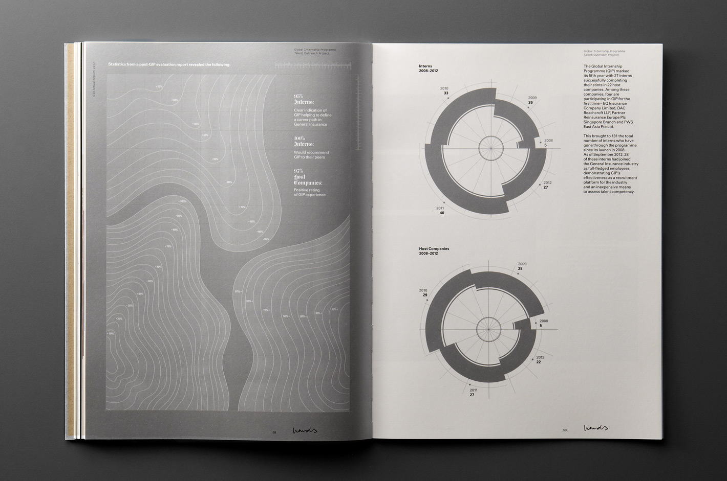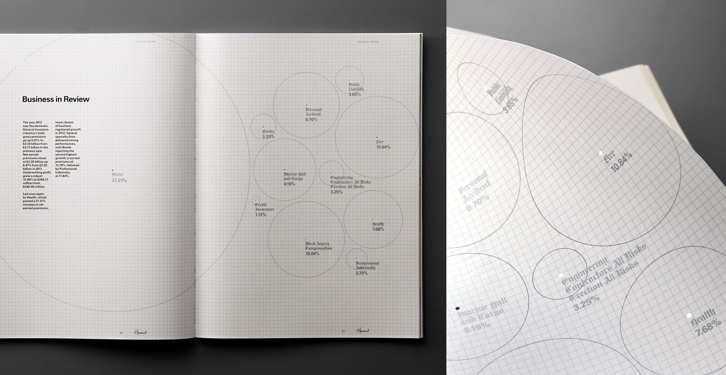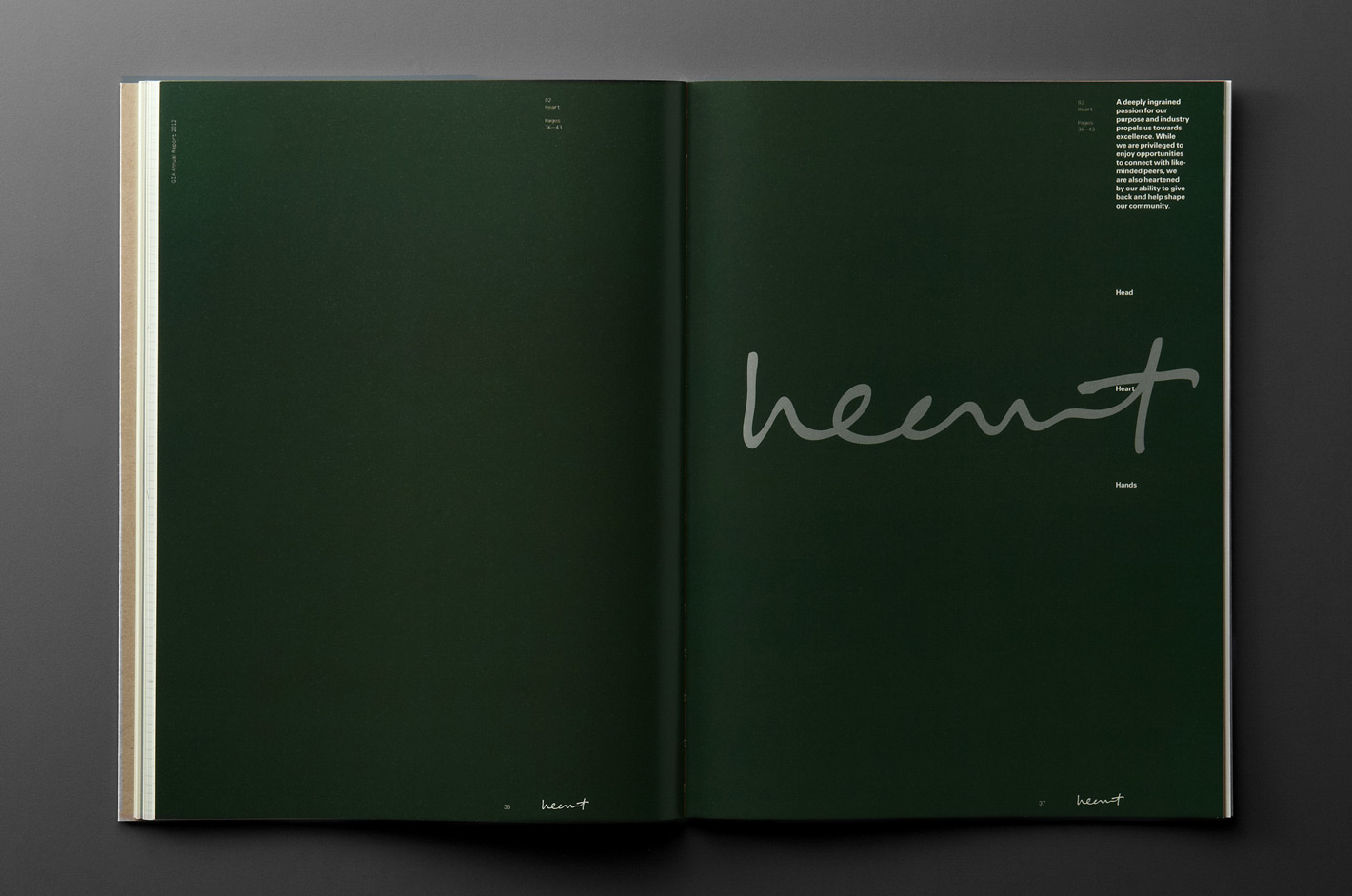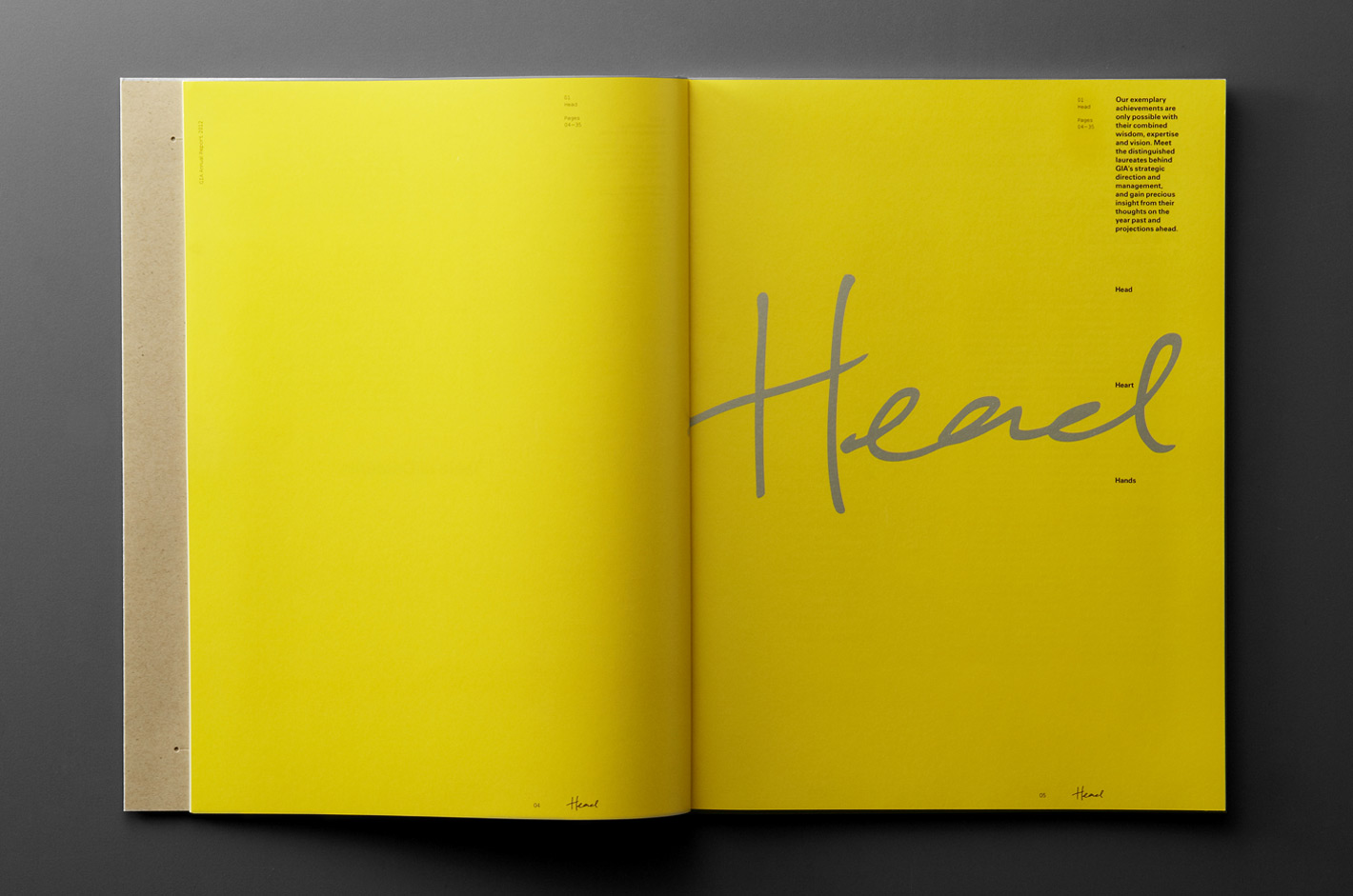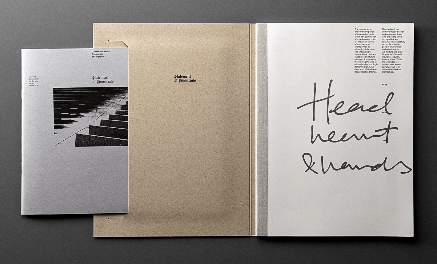 The direction for their 2012 annual report, titled “Head, Heart and Hands”, was inspired by education psychologist Benjamin Bloom’s Taxonomy of Learning Domains. In a significant point of departure, the visual language, materiality and print/finishing processes drew reference from educational metaphors and themes.