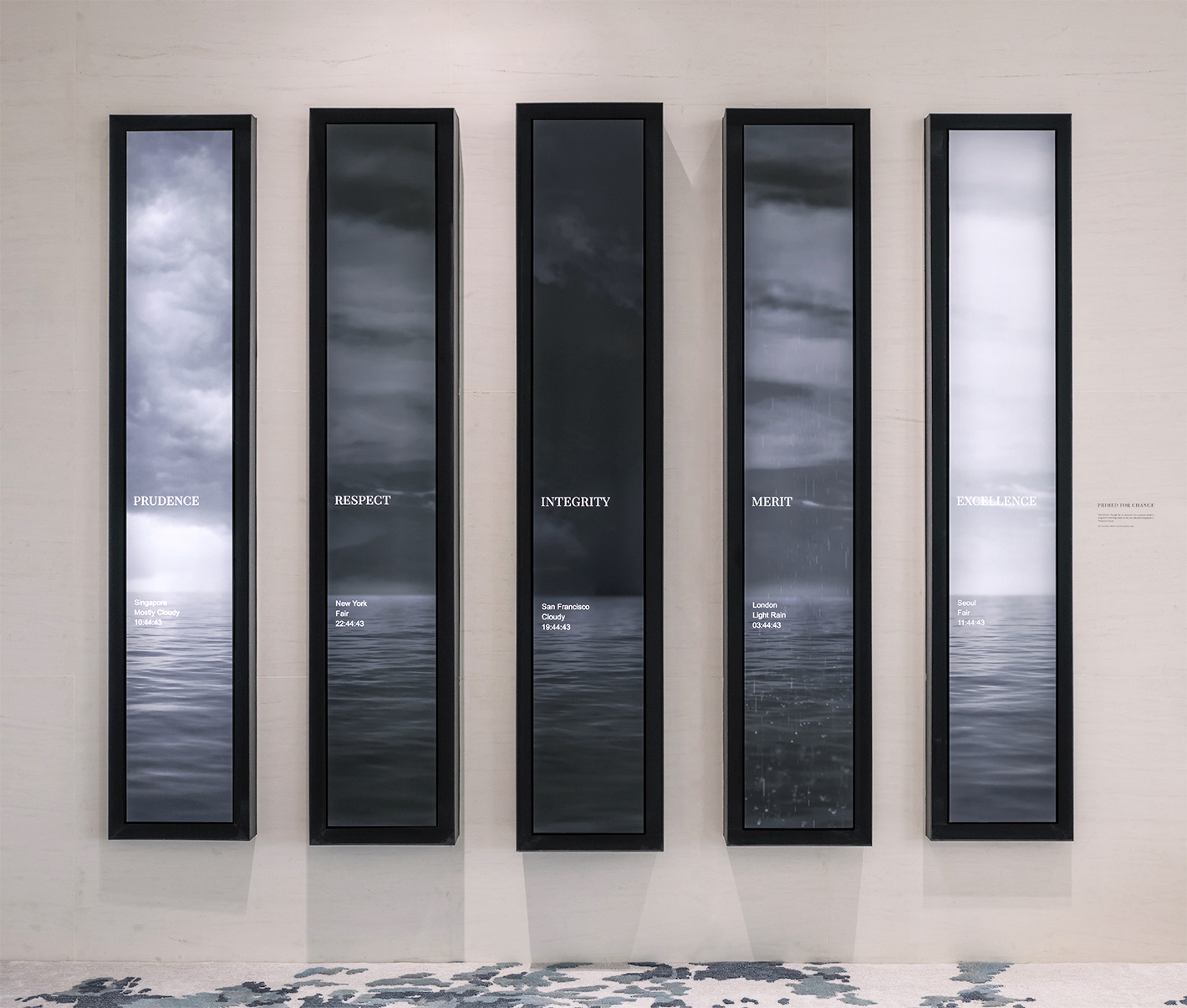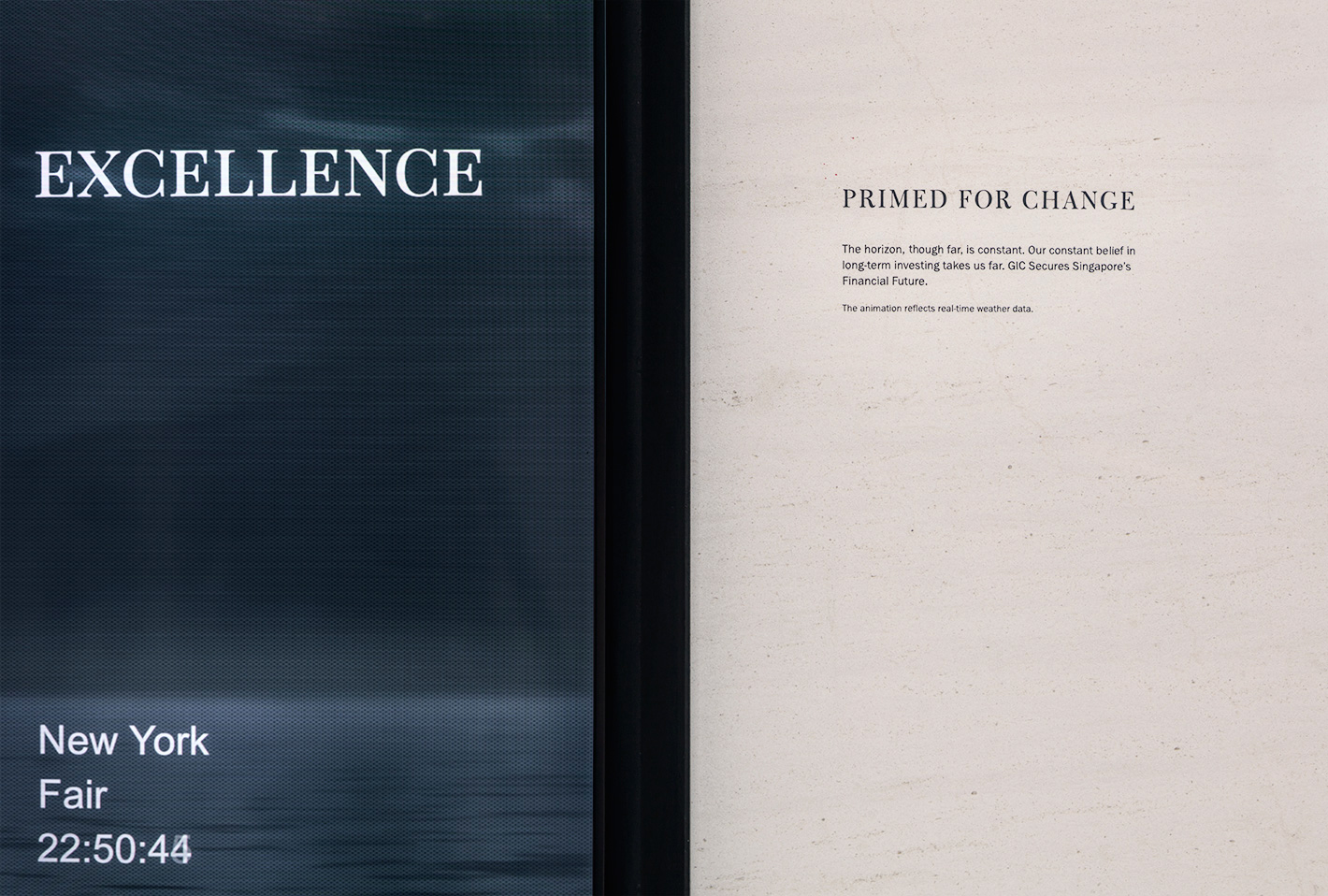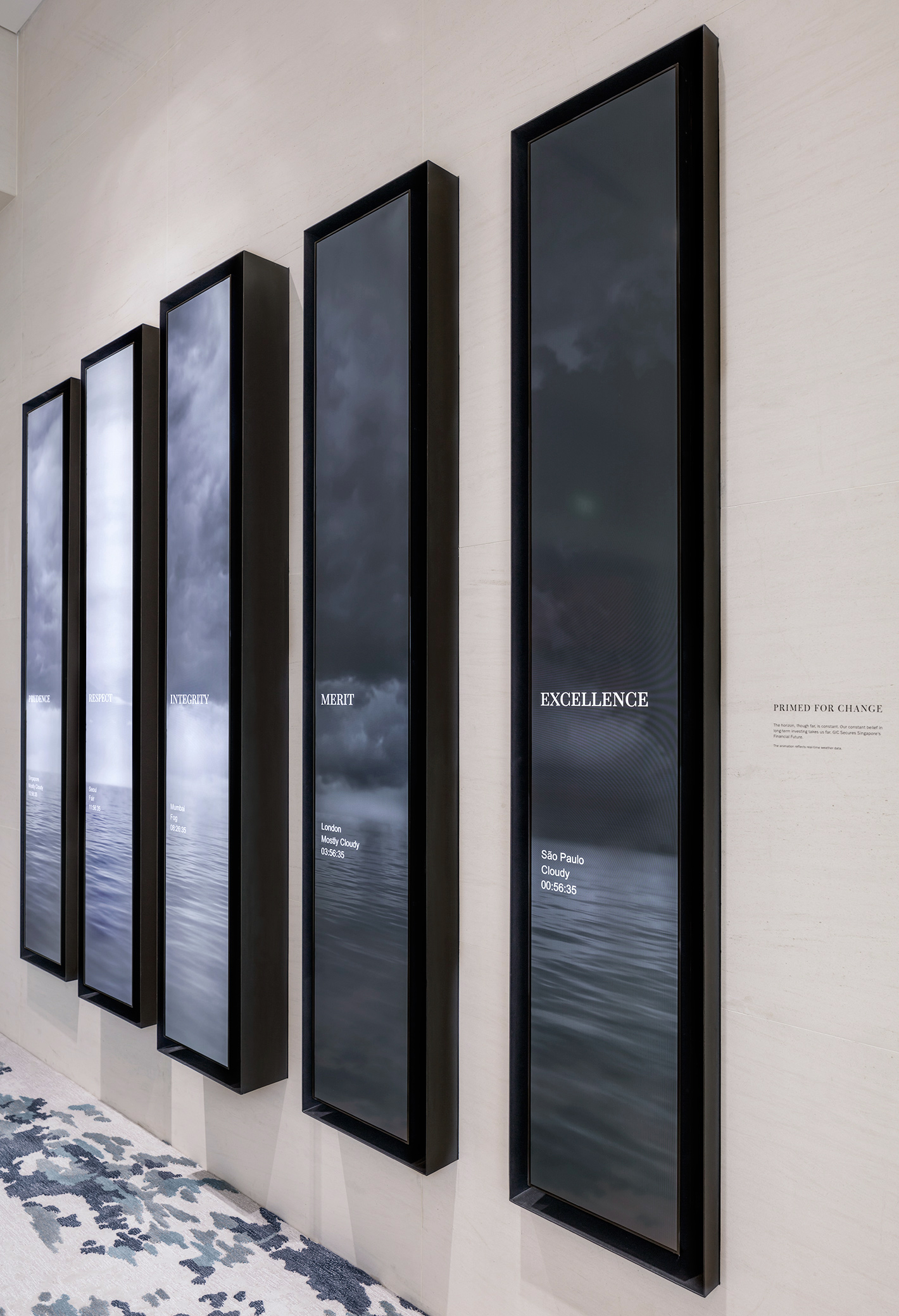 GET IN TOUCHGIC’s core values of Prudence, Respect, Integrity, Merit and Excellence are interpreted as five windows into the future. Using real time data, weather conditions in cities where GIC’s offices are located in were animated on five screens to depict the constant flux on the horizon and to reflect on the need for vigilance.