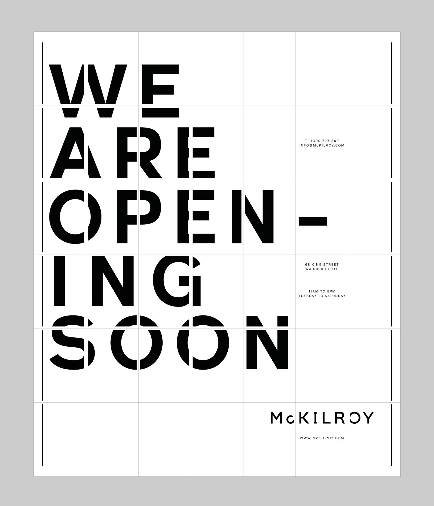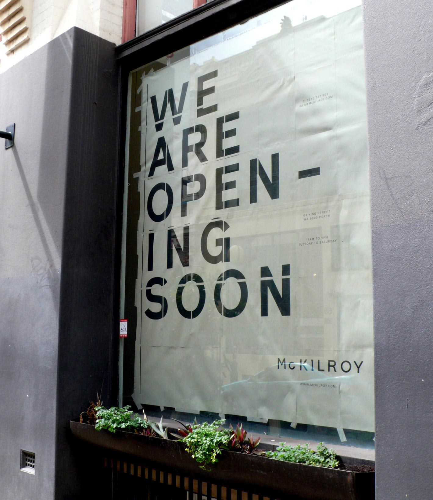 To pique the curiosity of passers-by during refurbishment, the storefront was entirely covered with paper, tiled to form “WE ARE OPENING SOON”. Sheets were then removed at random, as a lead-up to the message on the opening day, “WE ARE OPEN”.