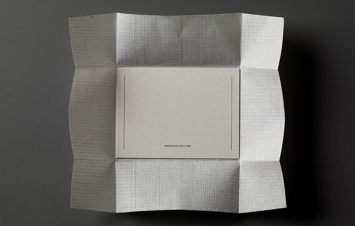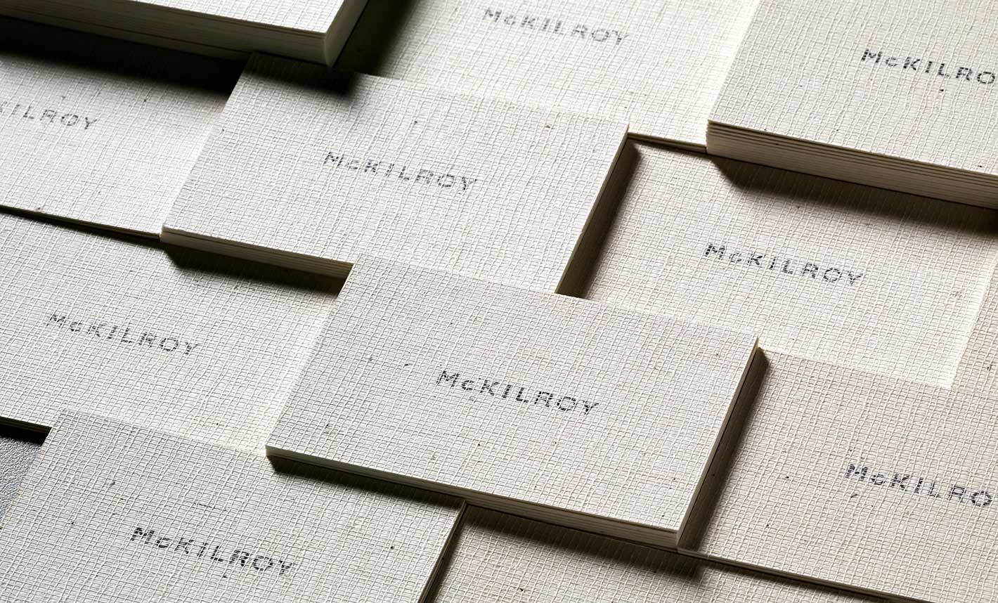 &Larry based McKILROY’s brandmark on the concept of enigma and anonymity. The result is a reconstructed hybrid of 8 sans-serif typefaces that intentionally appear obscured across all collateral through a selection of tactile materials and processes.