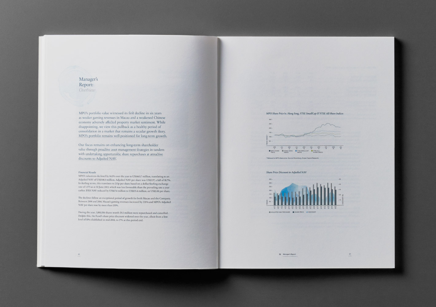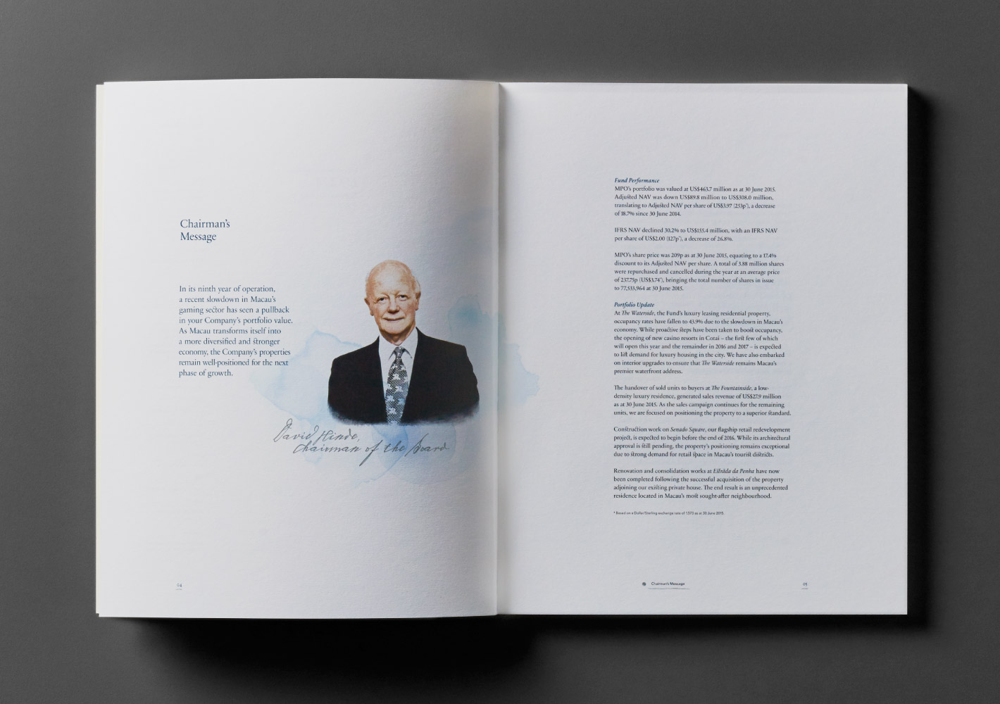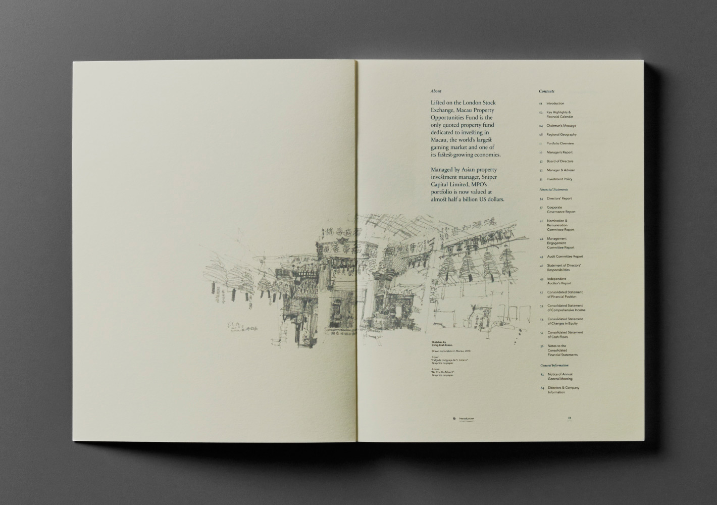 GET IN TOUCHFor our third iteration of Macau Property Opportunities Fund’s (MPO) set of interim and annual reports, we took inspiration from English painter George Chinnery’s drawings of Macau – a vivid depiction of the landscape of the Pearl River Delta in the 1800s – and Frank Gehry’s meandering and free-form sketches. Likening the fund’s astute vision to that of artists’, the concept pays tribute to MPO’s foresight and strategic focus on Macau.