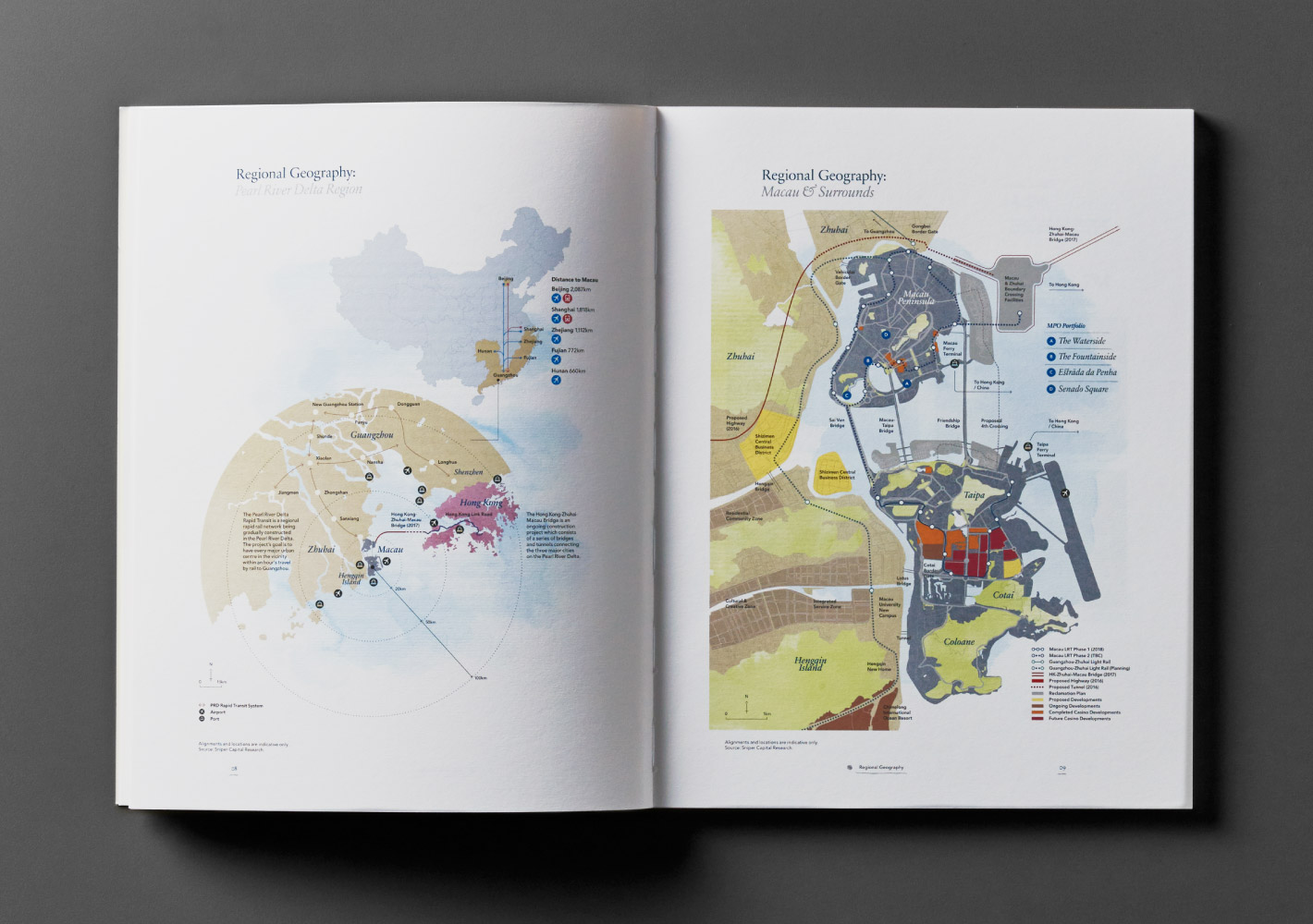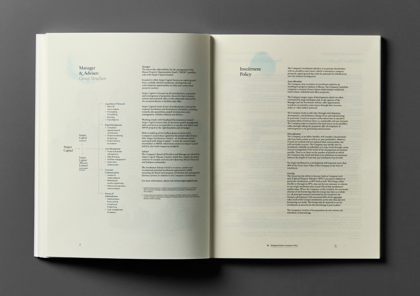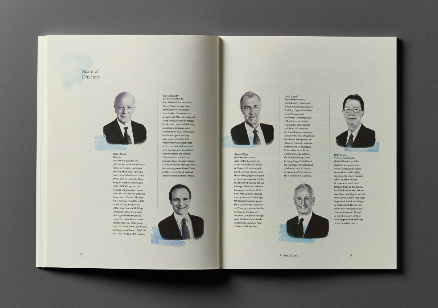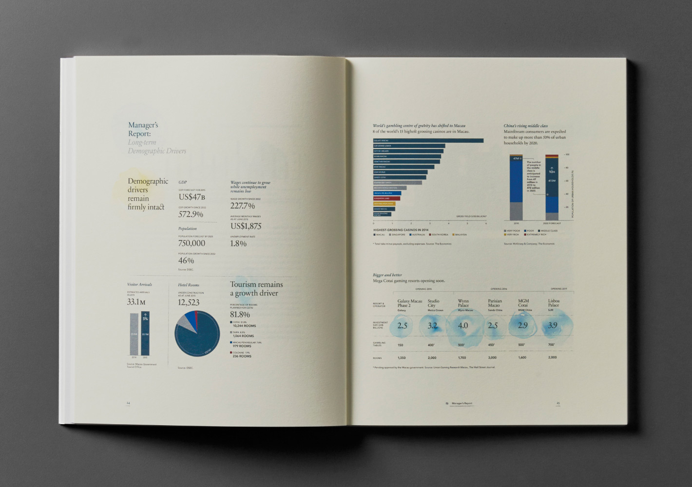 The reports showcase a series of sketches drawn on-location in Macau by renowned Malaysian artist, Ch’ng Kiah Kiean. As a foil to the stark graphite tones, we employed soft bursts of pastel blotches, typographic swashes and stylistic ligatures for added vibrancy and intrigue.