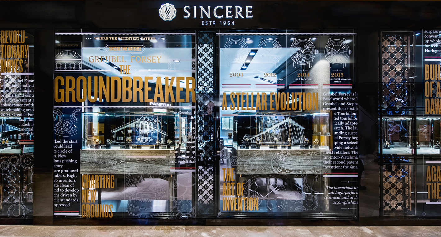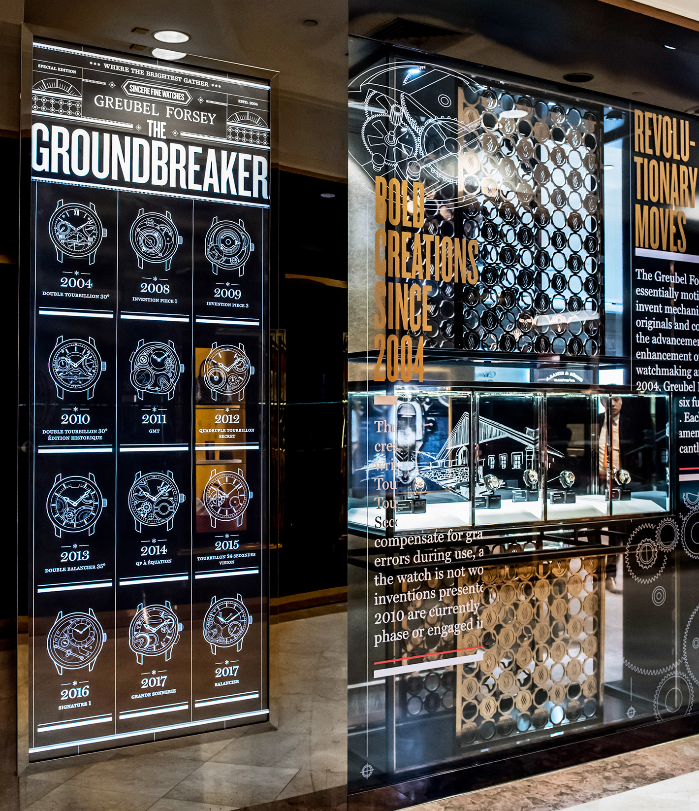 GET IN TOUCHOur brief was to design a showcase for Greubel Forsey, using Sincere’s façade at Takashimaya S.C.. Building a platform on the tagline ‘Where the Brightest Gather’, we created different personas for each brand to shine. In this case, ‘The Groundbreaker’ aptly communicates the inventiveness and technical virtuosity of Greubel Forsey that went into the making of 20 remarkable calibres.