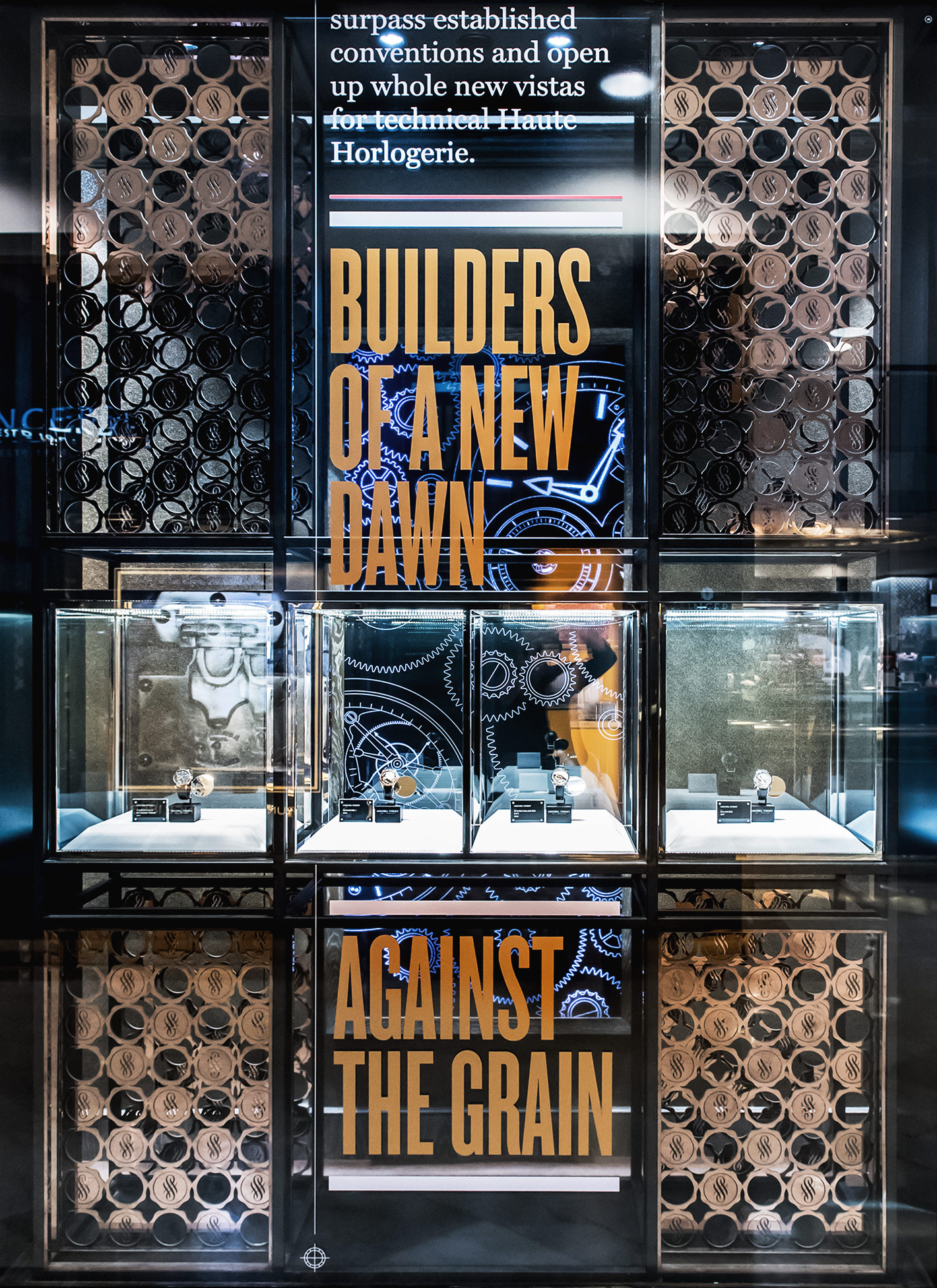 Dressing the windows in the style of a haute horlogerie journal, intricate line drawings and descriptions were laid out around the display cases, resulting in a eye-catching presentation that would draw both enthusiasts and casual passers-by to take a closer look. Subsequent showcases for brand partners, e.g. A. Lange & Söhne, will be developed in a similar vein, with equally considered titles.