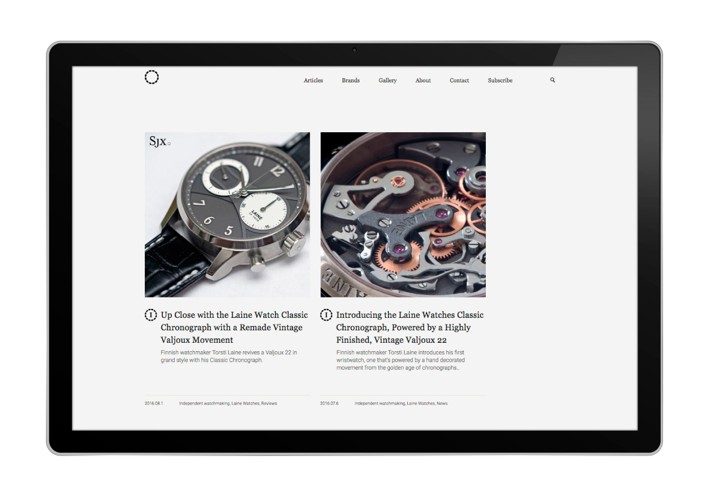 SJX’s logo represents what Watches By SJX is: incisive, straightforward and having the last word, hence the use of the period at the end of the logo. Upon closer inspection, the period is actually made up of 12 sections – an abstract representation of time, and, more literally, a watch dial or bezel. It was also created to look like a link bracelet, representing the succession of connected ideas delivered under one voice.