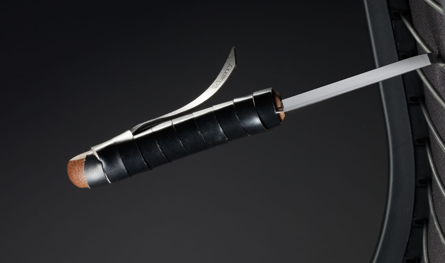 A gleaming knife with a leather-bound handle protrudes from the backrest, its blade narrowly missing the user’s vulnerable back.