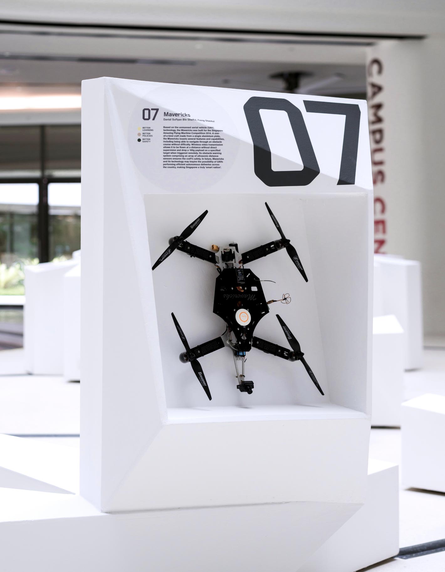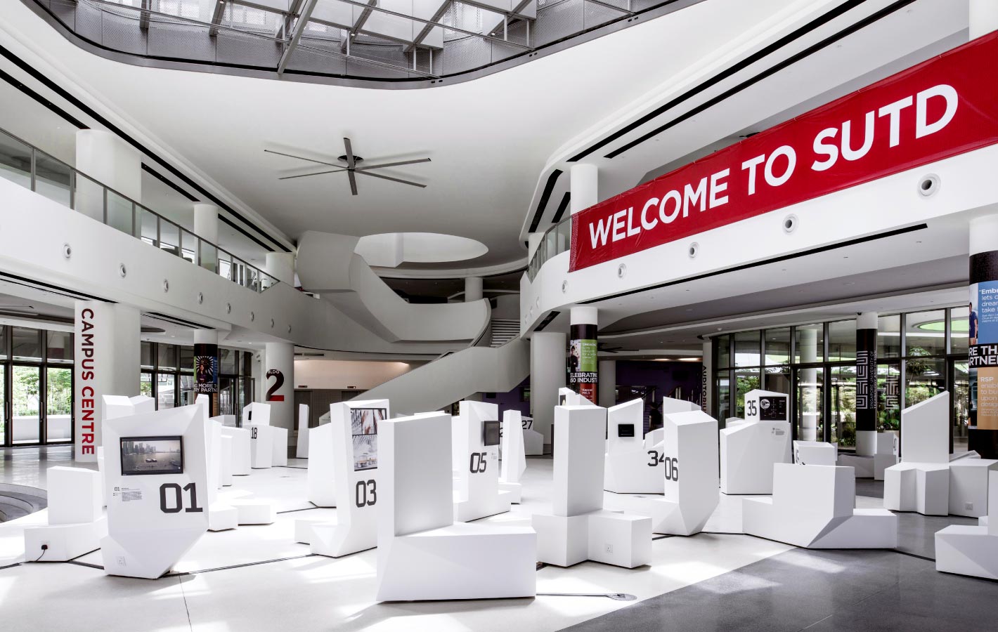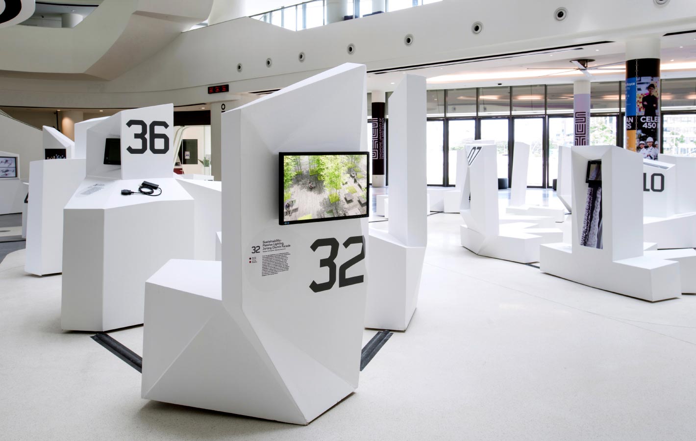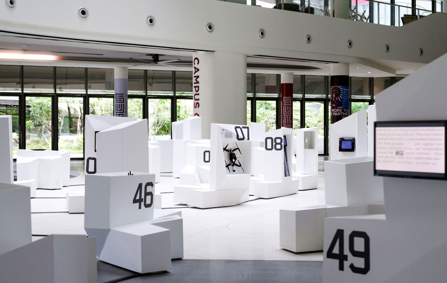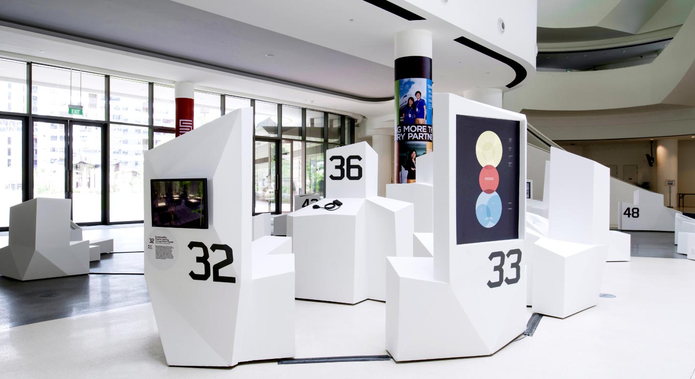 GET IN TOUCHIn commemoration of the nation’s golden jubilee, The Next 50 showcases 50 innovations that positively impact Singapore. The exhibition’s architecture and identity extensions were intentionally generated artificially by data and algorithms obtained from human traffic flow through SUTD’s main foyer, and the eight categories in which the inventions fall under. Set in Foundry Gridnik, the identity’s tech-like aesthetic correlates to the visual forms of the vitrines containing the exhibits.