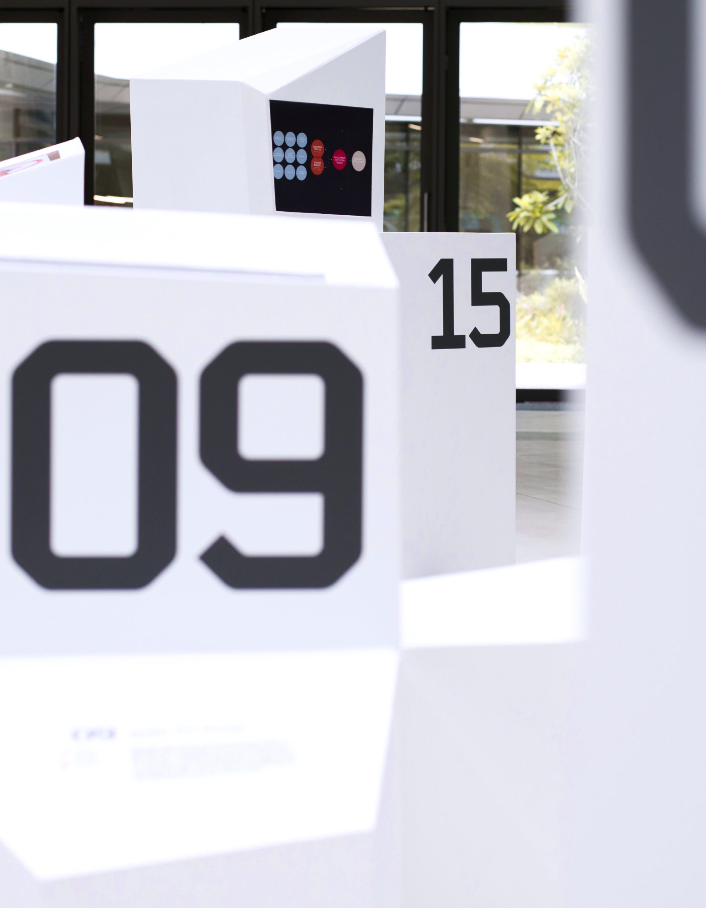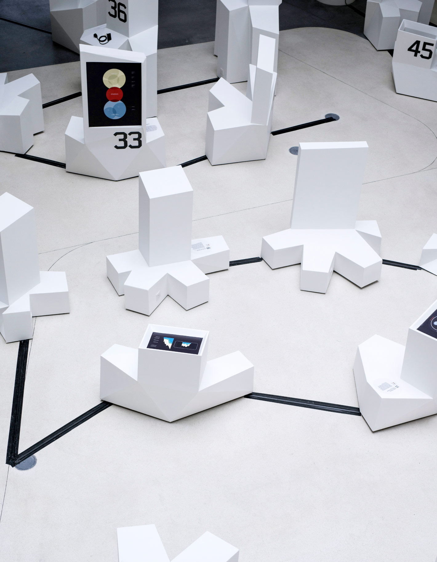 The resulting design resembles an urban landscape populated by inventions organised around different “neighbourhoods”, with the exhibits’ segregation being similar to house numbering. Akin to a built environment, there is no pre-determined path; visitors are encouraged to approach and explore from different points and angles.