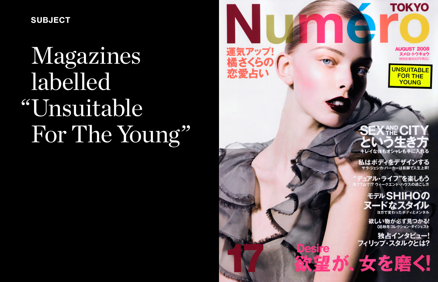 GET IN TOUCHIn Singapore where the government and population is largely conservative, societal progress treads a fine line by forbidding nudity and outright pornography, but allowing the conditional sale of ‘adult-interest lifestyle magazines’. While considered tame by more liberal societies, such approved publications must be tagged with a prominent label that says “Unsuitable for the Young”. The warning aims to protect children and to avoid offending conservative citizens.