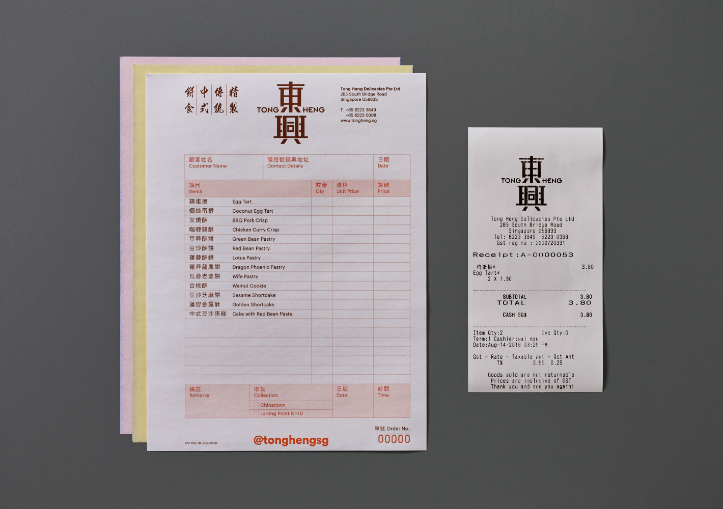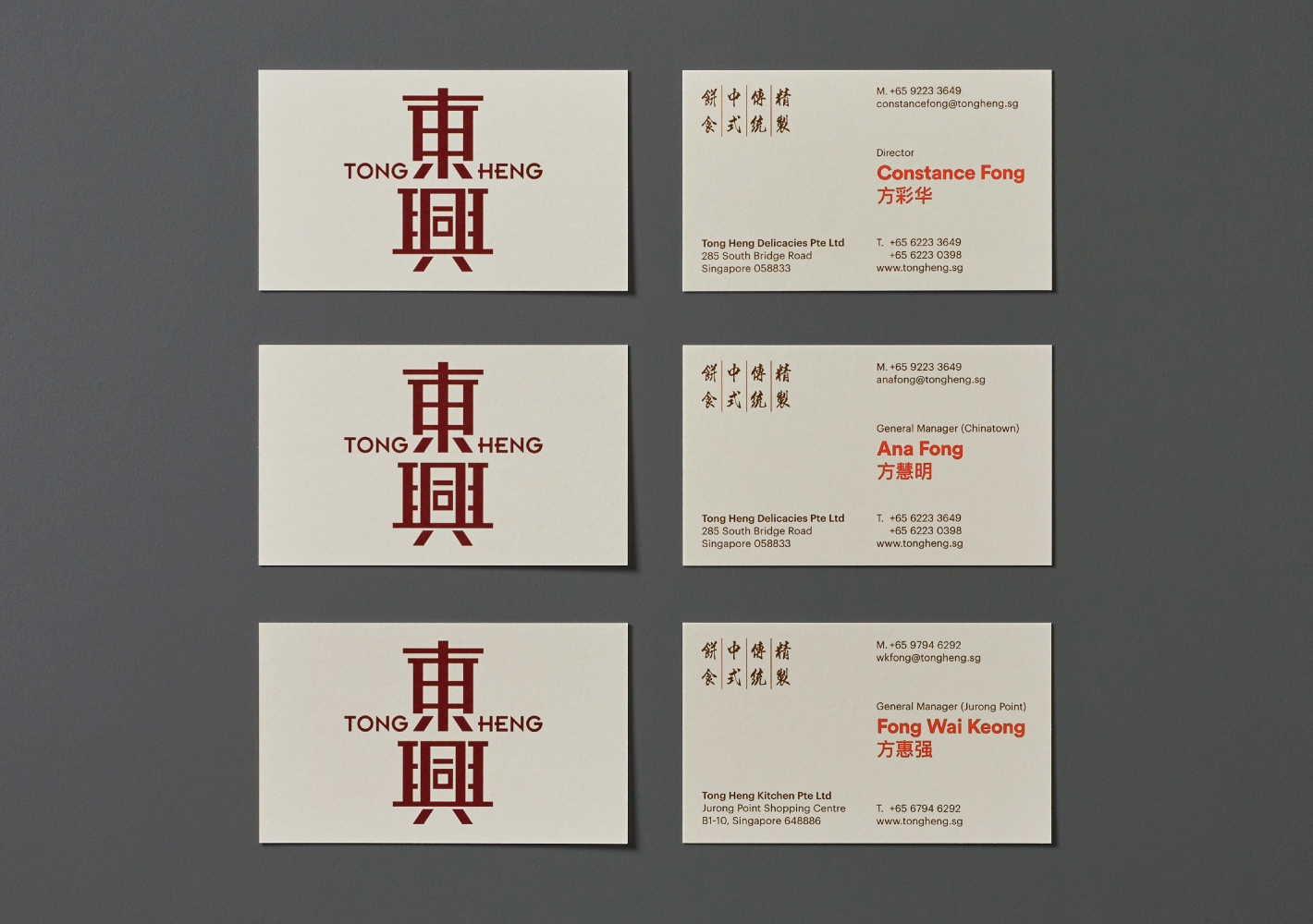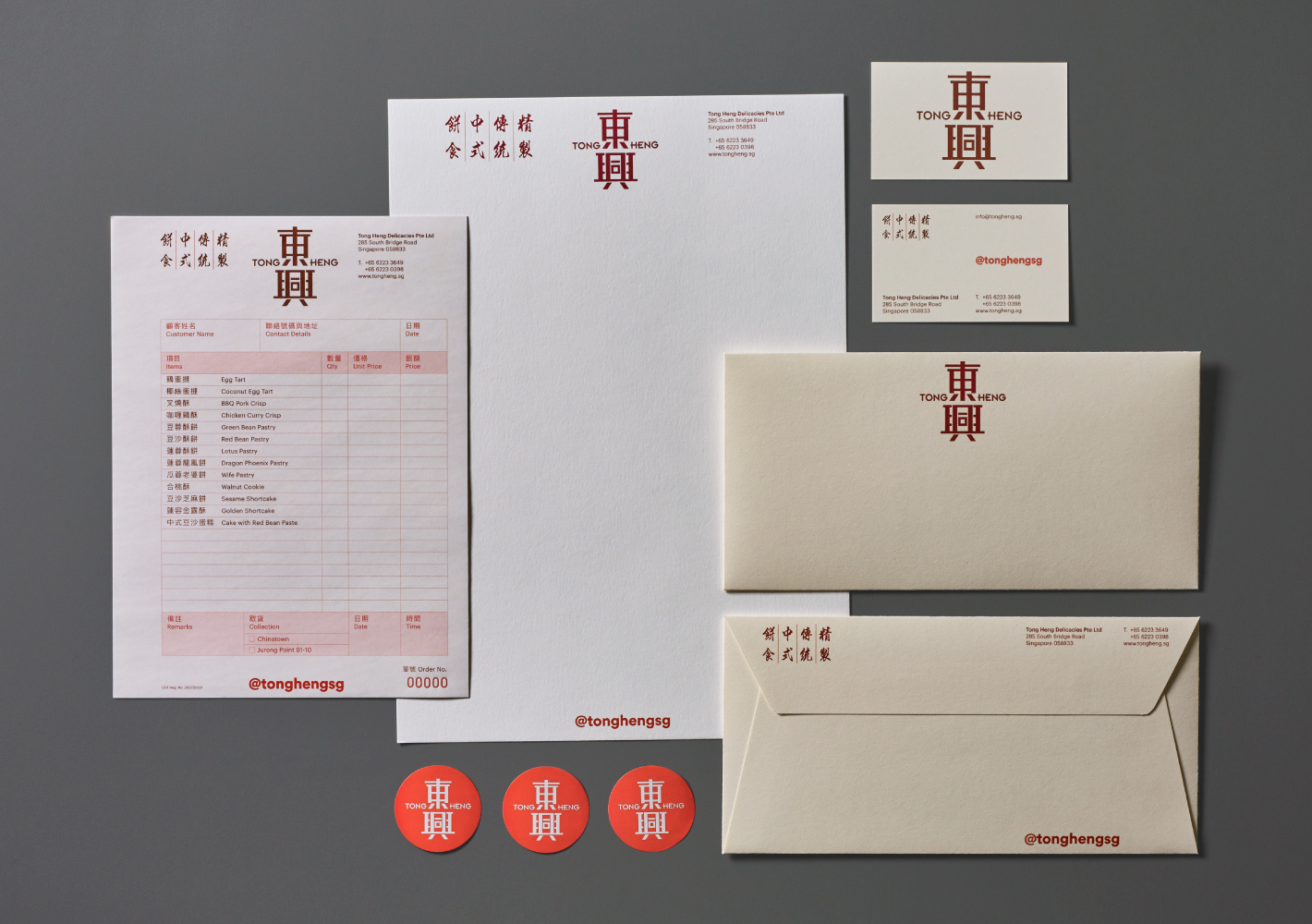 When designing Tong Heng's corporate stationery, we were conscious in exercising restraint with the colour palette, focusing on functional aspects of information and typographic hierarchy. The owners were pleased to see that we retained their original handwritten calligraphy on the brand collaterals.