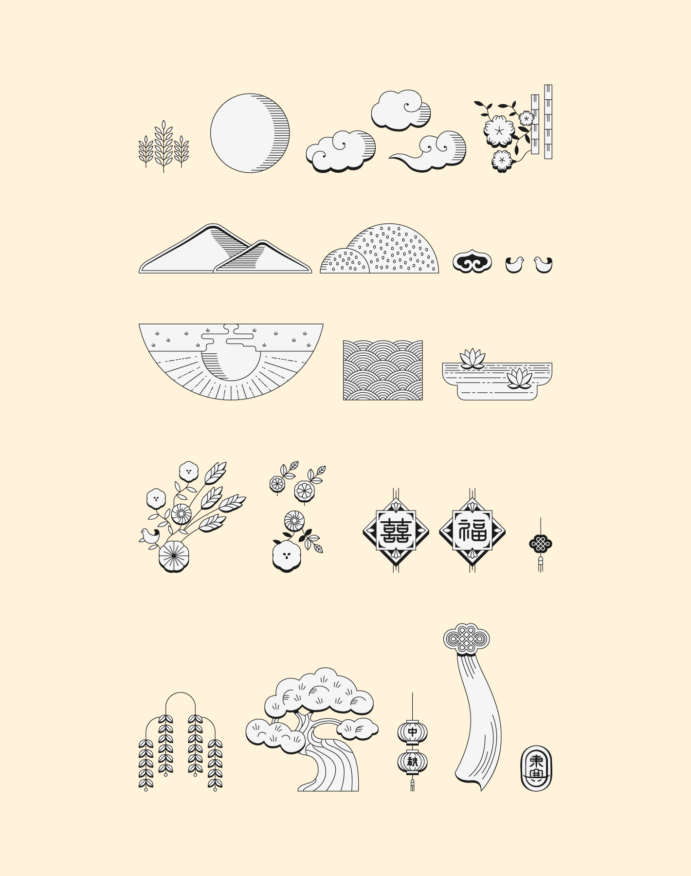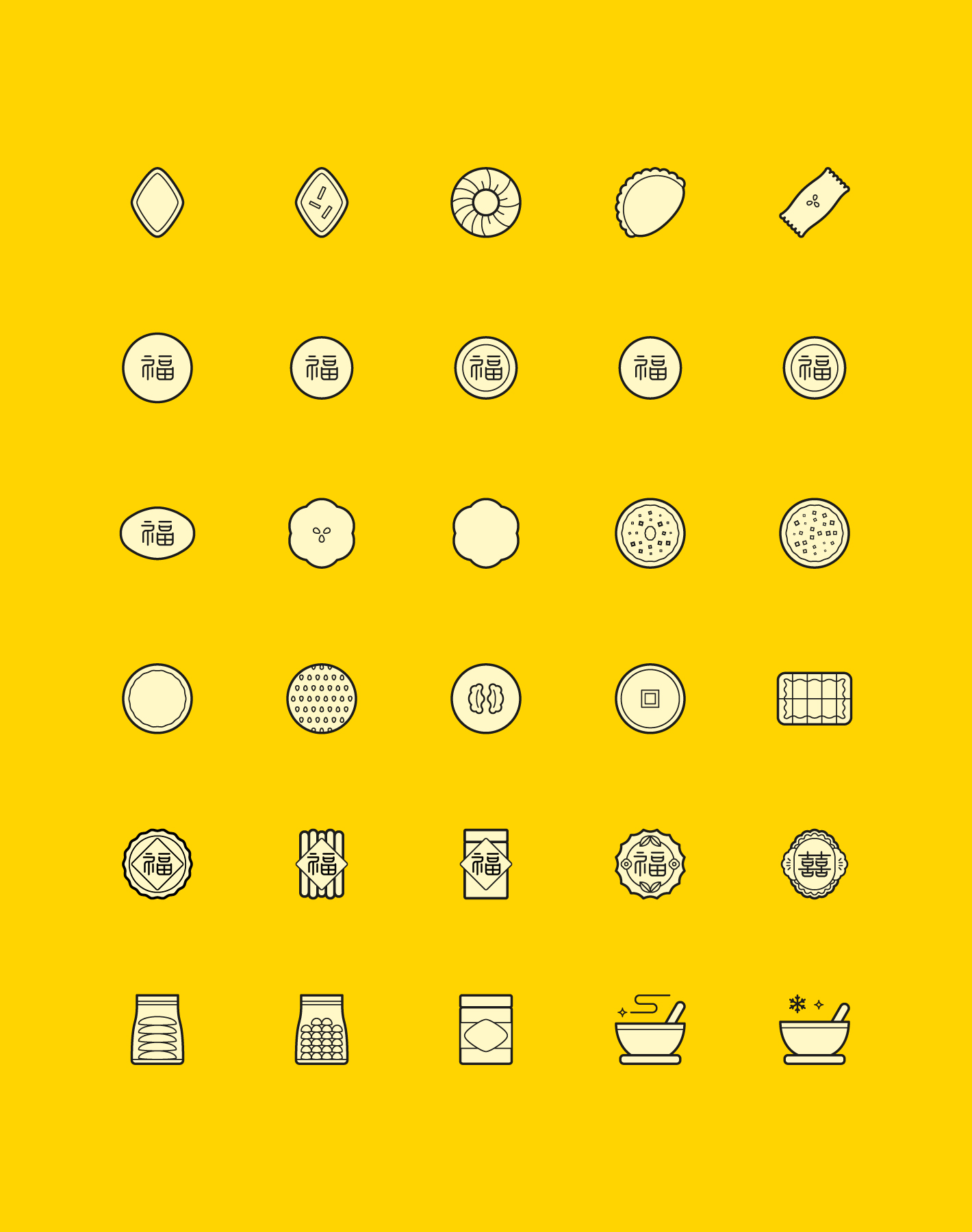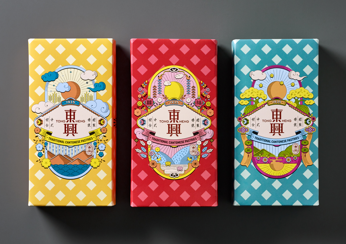Designing with this in mind, what emerged was a vibrant portrayal of the essential elements of the brand: the diamond shape of Tong Heng's signature egg tarts, 'lucky clouds' and other Chinese symbology for auspicious days, various shapes of pastries and ingredients, etc. We also re-introduced the old logo as a seal of quality.