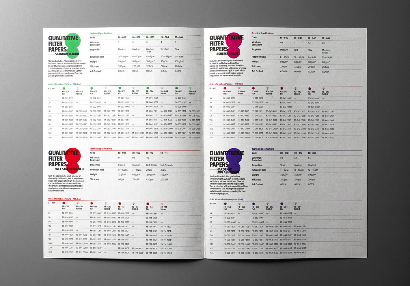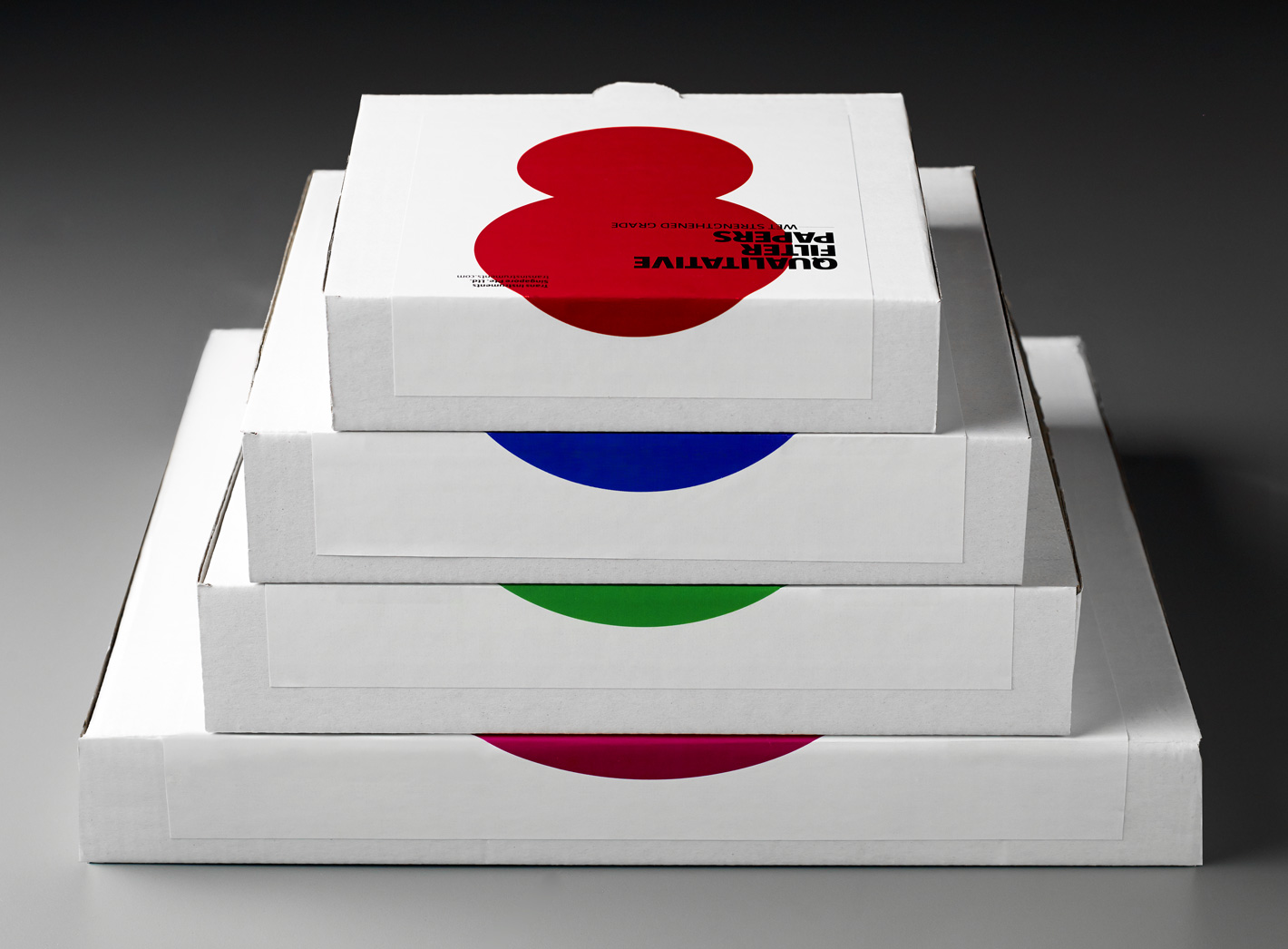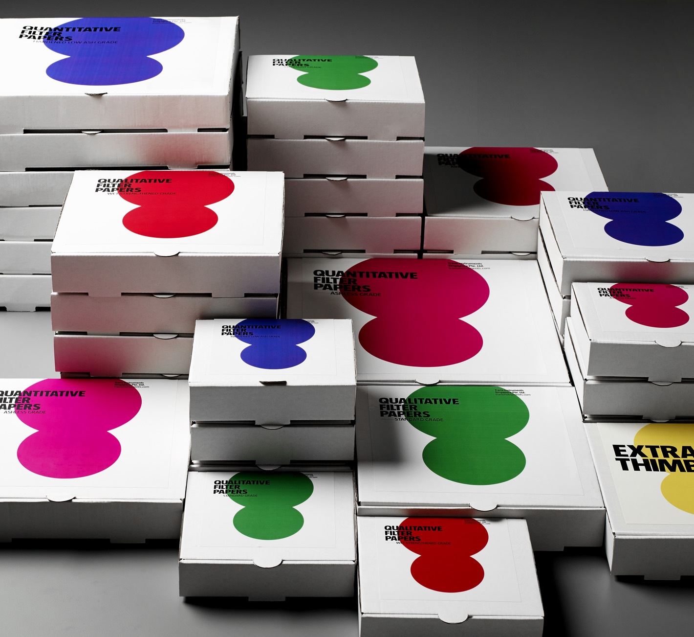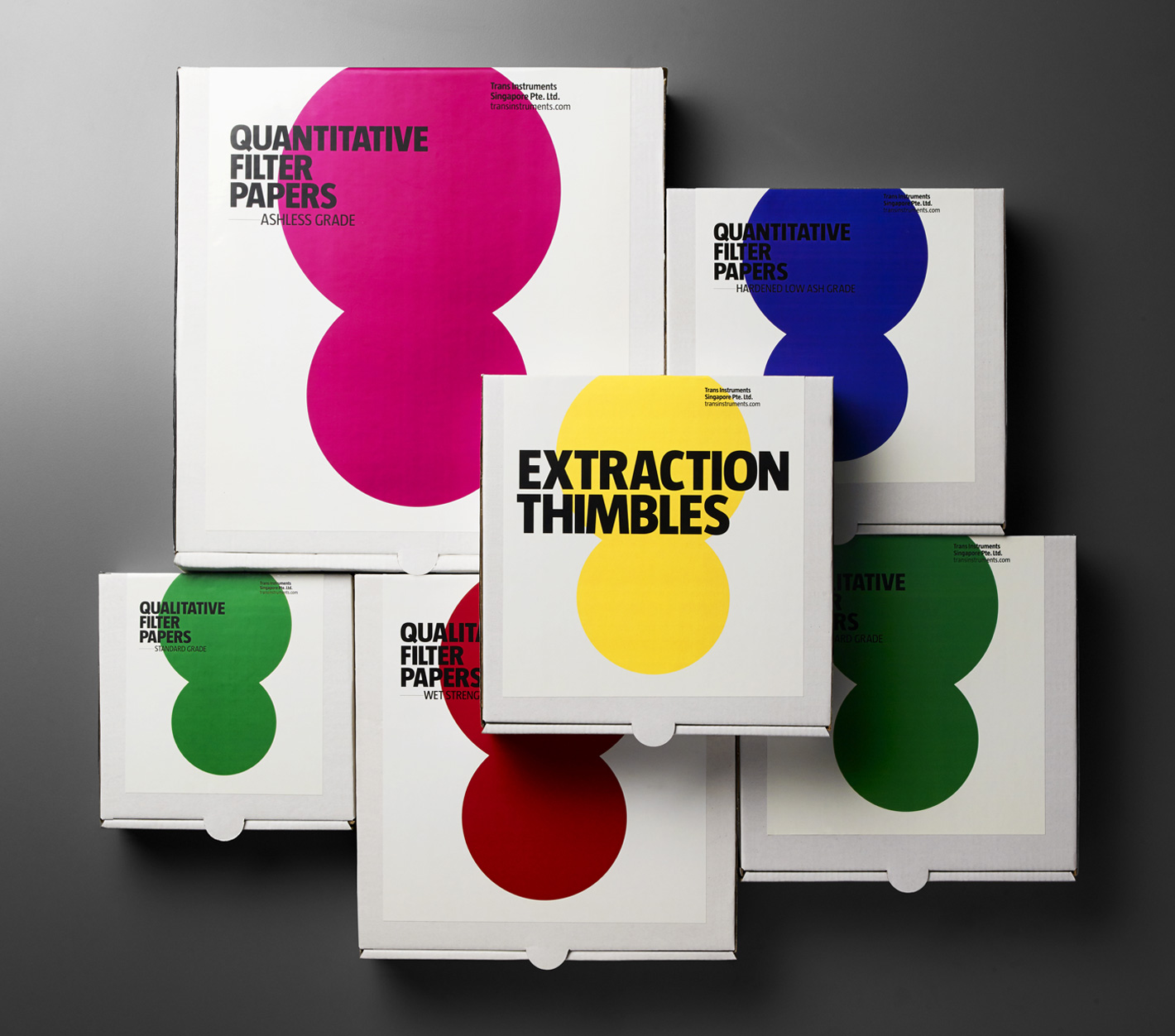 An abstract graphic was designed to represent the filtration process, whereby larger particles are retained in a filter while smaller particles pass through. The boxes were designed such that they formed a colour coding system when stacked in the warehouse for easy identification.
