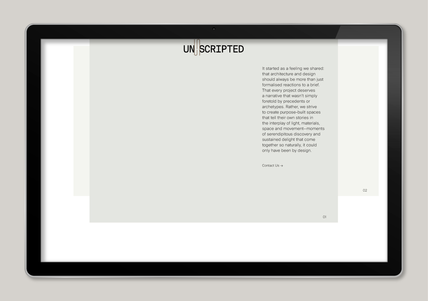 When &Larry was approached to design the identity for thier new practice, we were intrigued by their story and way of thinking. The founders had banded together out of a shared belief that too many projects tended to be exercises in ‘scripted’ outcomes, that the design of a building or a space was locked into preconceived notions from the moment a brief is put out. Instead, they cherished the rare opportunities when a project owner desired fresh and inspired thinking that explored possibilities beyond the usual considerations.