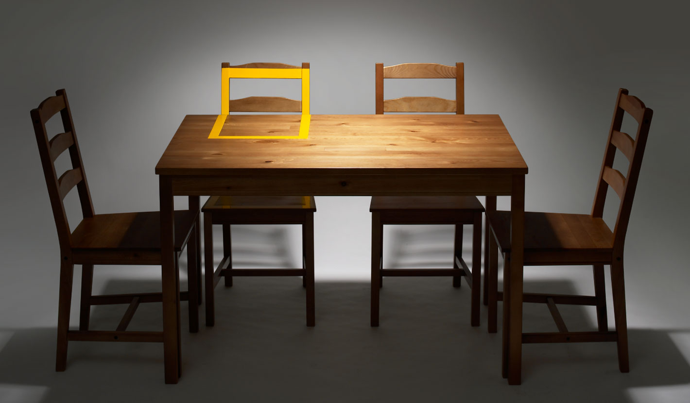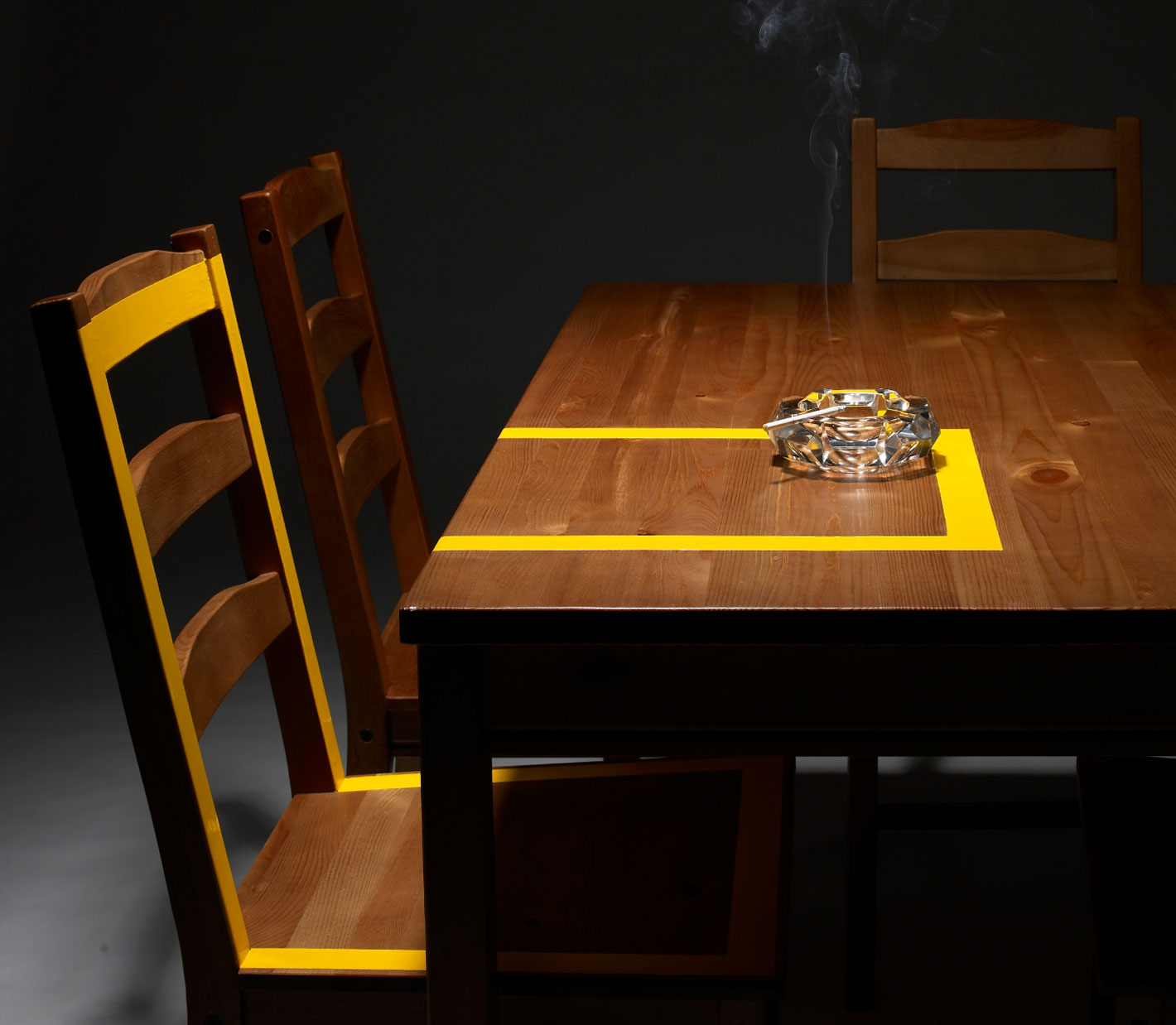 The absurdity of local smoking laws hit me in the face one morning as clouds of secondhand smoke billowed over from a chap puffing away within the yellow confines of the smoking zone. This experience has been translated into a simple dining table with a clear setting for one smoking guest – a chance to ponder issues of legality versus morality in an intimate fashion.